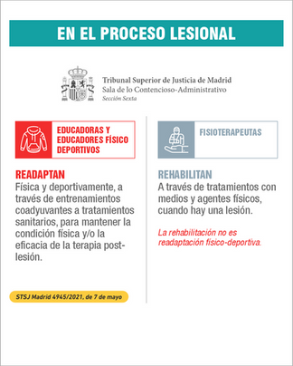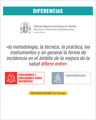 TambiĆ©n dicha Sentencia (mĆ”s información) distinguió las competencias entre quienes se egresan del Grado en Fisioterapia y quienes lo hacen del Grado en Ciencias de la Actividad FĆsica y del Deporte: los primeros se ciƱen a la cinesiterapia y la rehabilitación, mientras que los segundos se enmarcan en el ejercicio fĆsico y la readaptación fĆsico-deportiva.