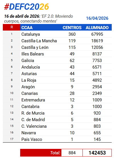 El #DEFC2026, celebrado el 16 de abril, ha reunido a 884 centros educativos y 142.453 escolares en toda España, consolidándose como una de las mayores movilizaciones educativas vinculadas a una materia. Bajo el lema «EF 2.0: Moviendo cuerpos, conectando mentes», la edición de este año ha conectado la Educación Física con la realidad digital del alumnado, mostrando su capacidad para educar de forma crítica y consciente en un entorno atravesado por la tecnología. El éxito alcanzado refuerza el papel del personal docente y proyecta nuevos retos de cara al #DEFC2027.