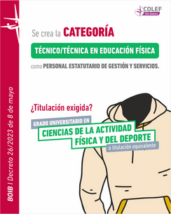 El āDecreto 26/2023 de 8 de mayo, por el que se crean nuevas categorĆas de personal estatutario en el Ć”mbito del Servicio de Salud de las Illes Balearsā, publicado el 9 de mayo de 2023 en el BoletĆn Oficial de Illes Balears en su artĆculo 8 crea la categorĆa de tĆ©cnico/tĆ©cnica en educación fĆsica y dice asĆ: