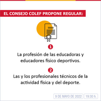 La respuesta a todas estas preguntas el próximo 9 de mayo a las 19:30 h en el canal de YouTube del Consejo COLEF. Vicente Gambau, presidente del Consejo COLEF, presentará en directo las propuestas que la corporación colegial estatal ha elevado al CSD para la ley de #RegulaciónProfesionalYA. Sonia Herce, secretaria general del Consejo COLEF, hará las veces de moderadora para poder trasladar todas aquellas preguntas que surjan a través del chat. Es una oportunidad única para que resuelvas en director todas las dudas que puedas tener.